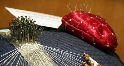 Traditionally, the pins were made of brass and varied in length and thickness. The choice of pin size was dependent on the thickness of the thread.