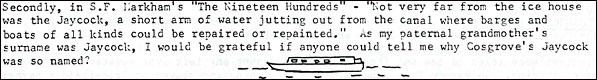 The Buckingham Arm in the 1950's Having a passing interest in canals (holidays on the Shroppie, Ashby and Caldon canals over the past few years) I was aware of the existence of the Buckingham Canal Society and their efforts to get at least part of the Buckingham Arm back into commission. As I was born in Old Stratford in 1947, and lived in the South Northants/Milton Keynes area until I moved to Devon in 1986, I knew the Stratford Arm particularly well from boyhood rambles along its overgrown banks. Whilst too young to actually remember the canal in its working days, I can certainty remember working boats on it, or perhaps more correctly, IN it. But more of that later... Although I can remember other bits of the Arm, and parts of the Grand Union when it carried working boats, my main story concerns the stretch of canal between what is called Bridge No 2 on the Stratford Arm (785418) and Bridge 5 on the Buckingham Arm (774401). The reason for this is that this encompasses the approximate area that a 10 year olds legs were likely to carry him from his home! Bridge 2 was a lovely stone structure with a wooden farm gate and stile at its northern side. It certainly had water underneath it in the '50's, as did all this stretch. The parapets were in good condition, the stone wall on the south eastern side was a bit ruined where people climbed over It to gain access to the towpath and the towpath went underneath the bridge on the southern side. Certainly the towpath lay along this side of the canal for its whole length at least as far as Deanshanger. The bridge serviced a stony track that ran from a gate on the Cosgrove road opposite what is still known as the "Quarries", and is still I think used by the Scouts for camping. This whole area both sides of the Cosgrove Road had obviously been used for quarrying as the fields were full of humps and bumps. The track to the bridge ran south along the edge of a field (with a dry stone wall on its eastern edge) to Bridge 2. This field was lower than the track, canal and Cosgrove road. In fact the Cosgrove road ran along the top of a small 15/20foot cliff face which was obviously the face of the quarry (limestone). The canal ran along a low embankment that gradually increased in height as it crossed Dogsmouth Brook. As a child this embankment seemed HUGE, I am sure it looks very small today! The field also held a rubbish dump close to the Cosgrove road which we were always warned to stay clear of. It contained a lot of ashes, still hot underneath, and one of the Slaymaker brothers was badly burnt when he fell through the crust that covered it. The canal executed a long curve on this embankment and was in water. I am glad you have identified the paddle gear and culvert at 783417. My memory recalls that this was a brick lined semi-circular culvert that ran down the southern slope of the hill through an area of rough land and into the brook. One of our favourite pastimes was damming this culvert with puddled clay from the brook which implies that there must have been water coming down it at times - meaning water in the canal. The culvert which took Dogsmouth Brook under the embankment was obviously a source of great interest to the local lads, it is reputed that some of the more daring waded through it to the far end. It is called Dogsmouth Brook by the way because of a spring that used to issue from a Dogs Mouth in the bank near the road bridge over the brook on the old Northampton Road at its junction with the Cosgrove road. The section of the canal between the Dogsmouth culvert and what is now the ASD was never easily accessible, as the towpath was heavily overgrown. We did get along it in 1963 however when the canal froze over for months. There was certainly a short arm at 782414 and I seem to recall a building made out of corrugated steel sheet and painted black near it, although whether it was a wharf or not I would not like to guess. This arm lay in the far (eastern) corner of a rectangular field bounded on two sides by the canal and was well overgrown in the 50's. In later years David Adams of Bridge Farm (opposite Riverside Garage) established ACE Plant Hire in this field. At the south-east corner of this field the canal made a 90degree turn west, with a short arm going straight into what we called “The Wharf". Although we never went into "The wharf" (it was private property), a little niggle at the back of my mind says there must have been a way of crossing this arm to gain access to the towpath which continued on the southern side of the main cut. I note that you have found evidence of a swing bridge at 782413 and this must have been it. By the late 60's the Wharf Arm had dried up and we used to walk across it through the reeds. This junction seemed quite big as a child, it was certainly quite an expanse of water and a popular fishing spot. There was also an old punt here, covered in black tar that we used to use to make the odd foray onto the waters of the canal. As I said, I think I can only ever remember going into Hayes Wharf once and this was from Wharf Lane. I can remember a great barn of a place like a Dutch barn, with old walls overgrown with ivy. From the junction with the Wharf arm to Bridge 1BA/4 at 781413, the canal ran along the north side of another rectangular field that served as the village recreation ground (known as the Rec.). I think there are houses there now. The boundary between the "Rec" and the canal was a high unkempt hedge with plenty of gaps to access the towpath. The eastern boundary of the "Rec" was the old stone wall of Hayes Wharf. The western boundary was Cosgrove Road - the old A422 to Northampton. As the major junction of the A5 and A422 from Northampton to Oxford, Old Stratford was very busy place before the opening of the M1. The enigmatic Bridge 1.4/4.... I can remember this bridge when it was a conventional narrow "hump backed" bridge so I would guess that is in the ‘50’s. However, as I said, the A422 w