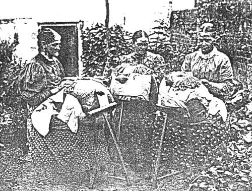 The price obtained for their beautiful lace was at that time about one penny per yard for the simple narrow types, and up to 3d. or 4d. for the more intricate patterns and greater widths. Lace collars and cuffs, the popular style of the day, were more rewarding but naturally demanded much greater patience and skill. Marketing of the finished lace and the execution of special orders were conveniently arranged through a well-known local agent, Mr. Armstrong, who travelled by pony and trap over a fairly wide area.