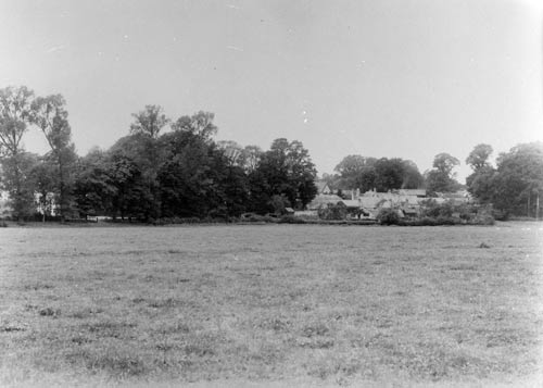 Gayhurst Village viewed from the river Ouse. Sixteen houses and an inn were moved onto the Newport Pagnell -Northampton Road after George Wrighte had created the landscaped park on the estate in c.1737. Two thatched stone cottages, the remains of a row of seven more cottages, bear the inscription GW 1738 and another pair 1739