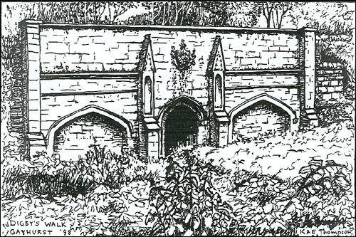 Digby's Walk runs round the west side of Gayhurst House. It now leads to a tunnel under the Newport Pagnell - Northampton road. The tunnel was constructed in the middle of the 19th century, and therefore postdates the Gunpowder Plot by about two hundred and fifty years. The drawing shows the western portal to the tunnel.