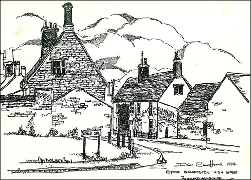 This drawing shows Eastside Farm (centre) and the entrance to Berkeley Close. Several old houses which lined the High Street were demolished to create the road entrance when Berkeley Close was built in the 1960s. A further two rows of cottages, to the rear of the High Street houses and parallel to them, had disappeared by the turn of the twentieth century. The three rows of cottages were known locally as Berkeley, hence the name of the new close. The building on the left of the picture is the Old Post Office. |