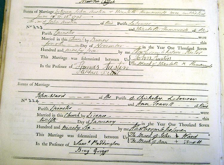 Because the shape of the page and the detailed text, separate photographs were taken of the top and bottom of each page. There are 4 marriages per page and hence 2 in each photo.