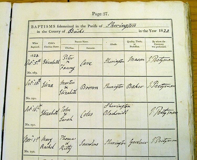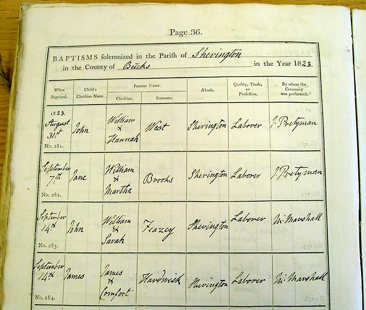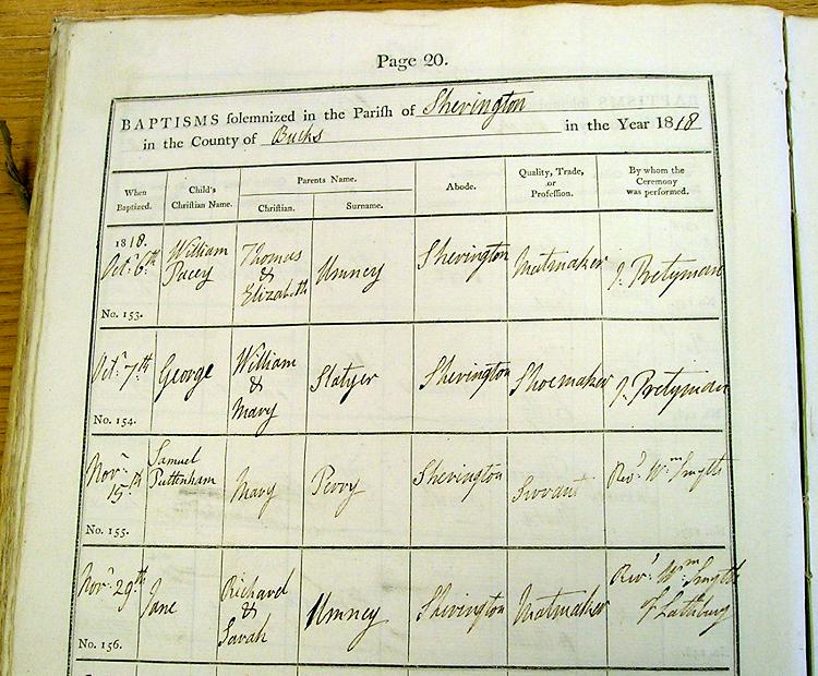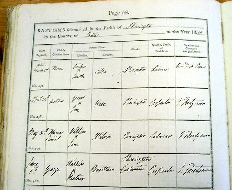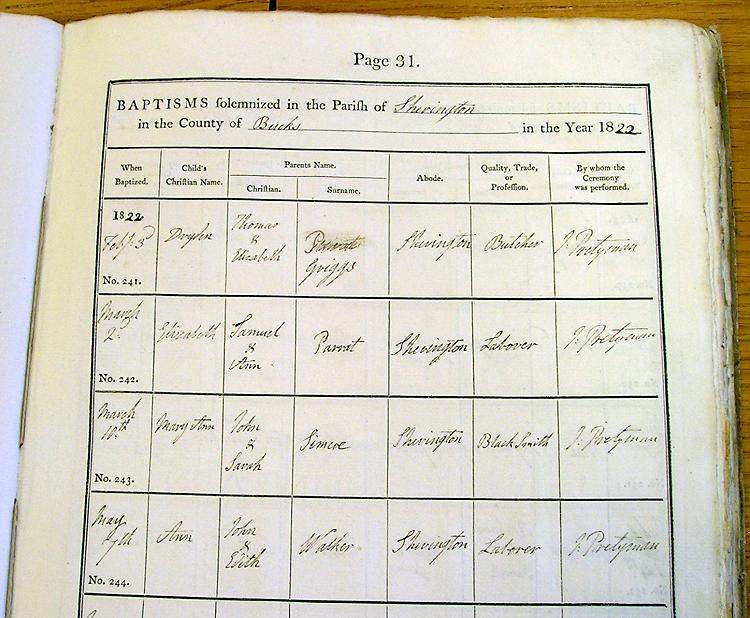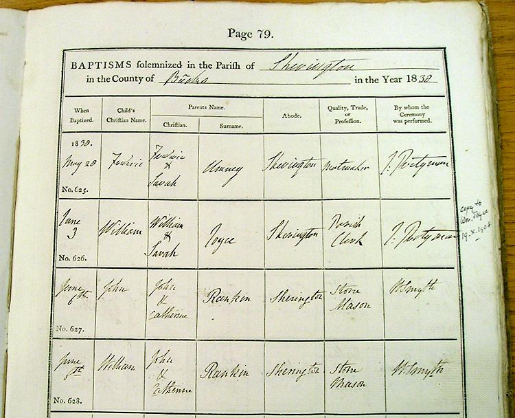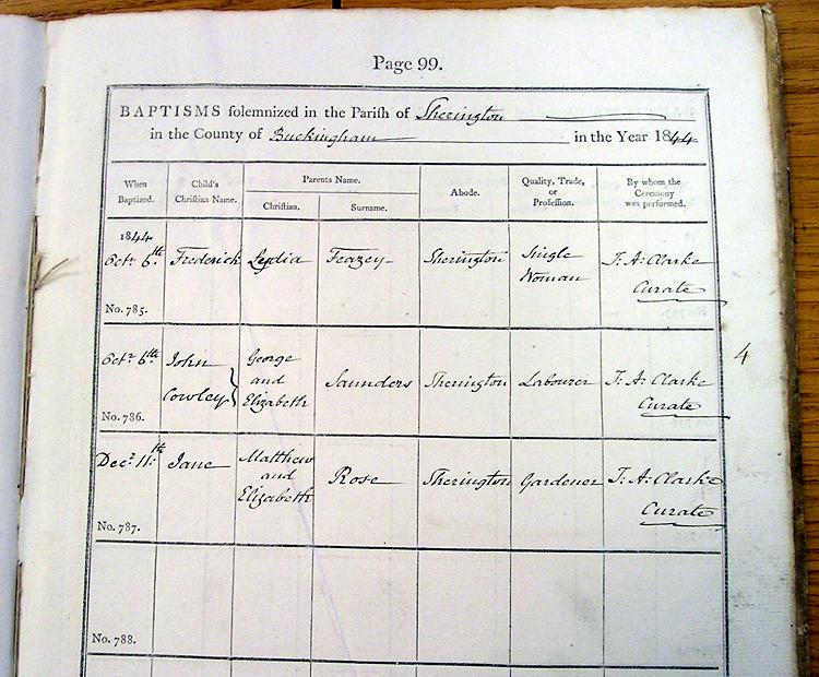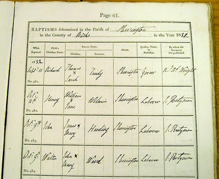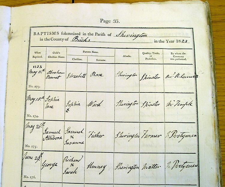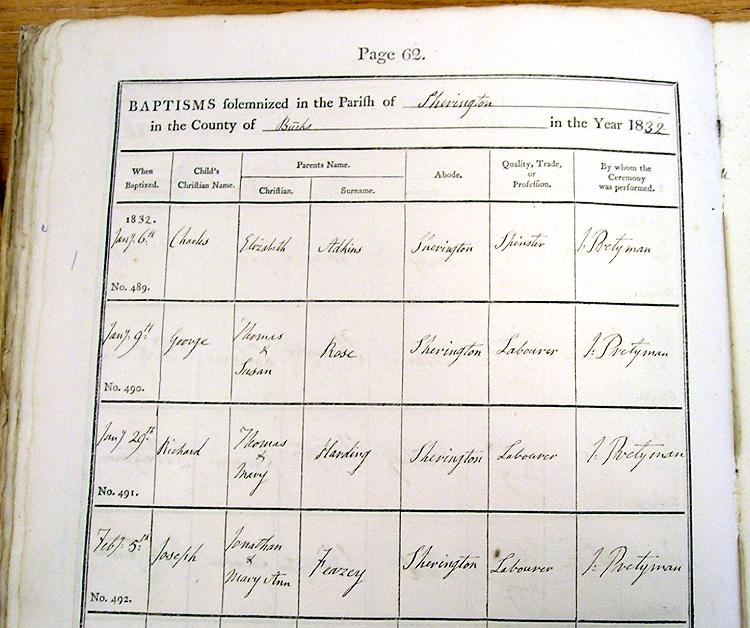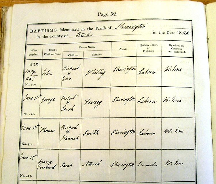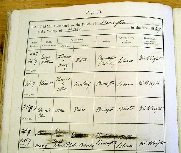 The St Laud’s Parochial Church Council has given Sherington Historical Society permission to take digital photographs of each page in all the Parish Registers, for use in family history research. However, entries less than 100 years old (i.e. after 1912) have not been copied.