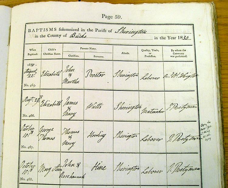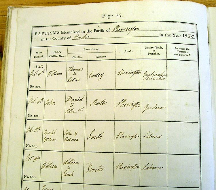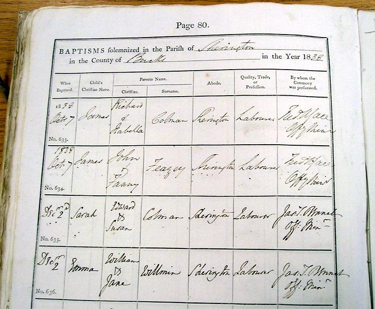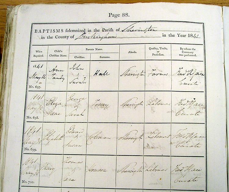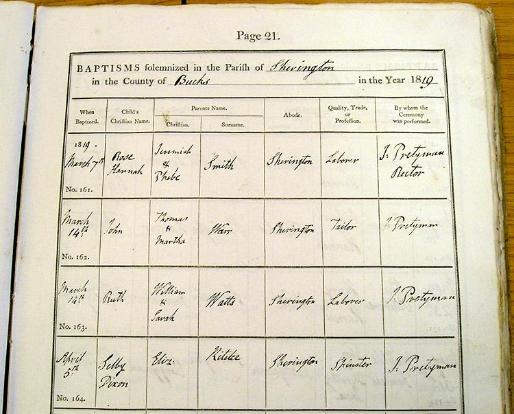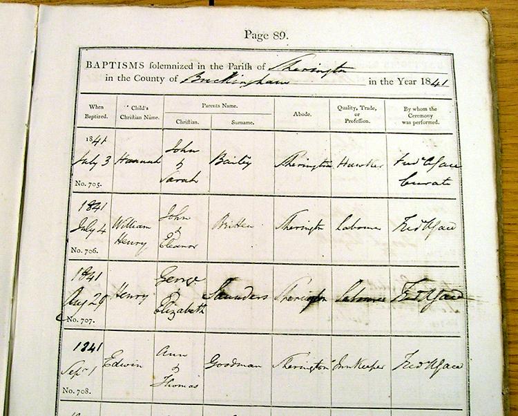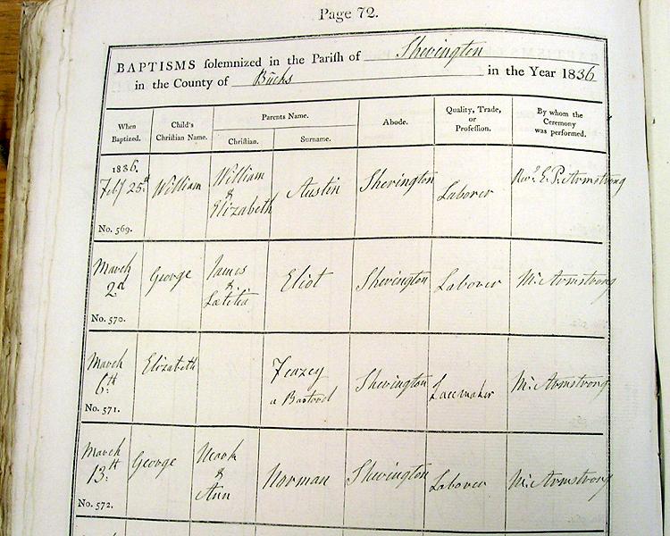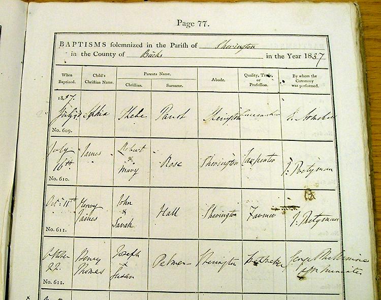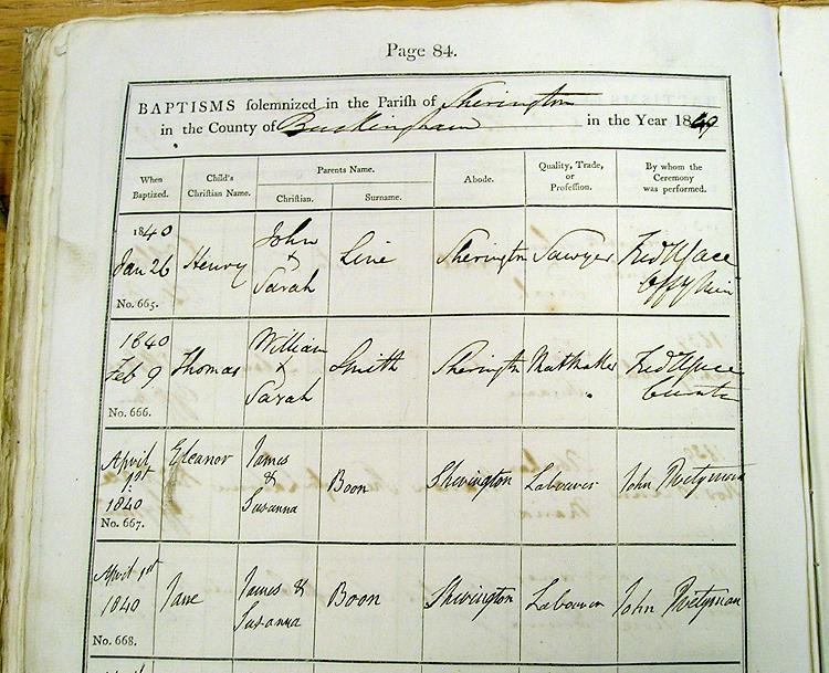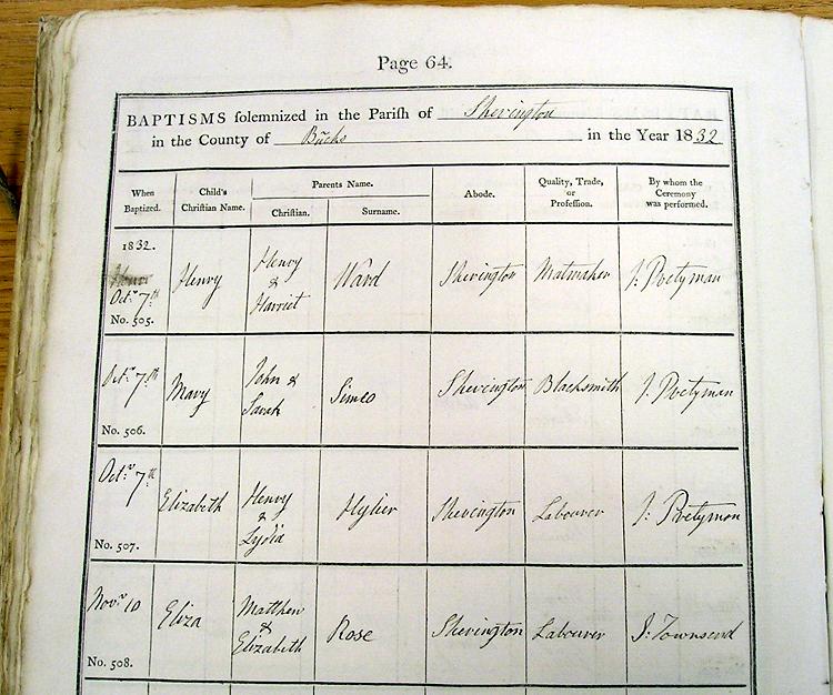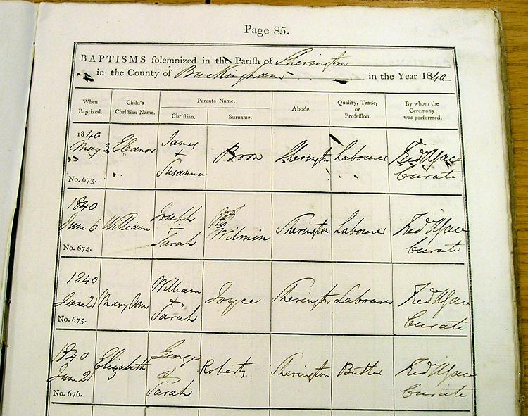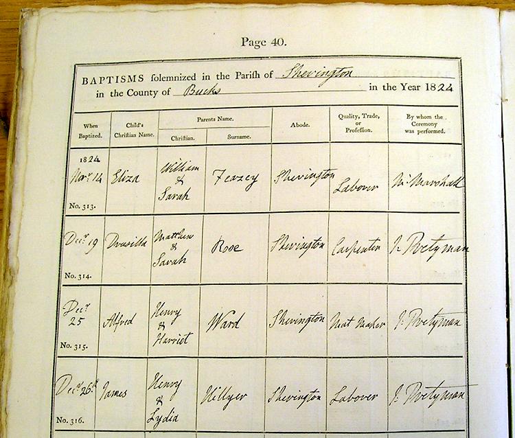 The St Laud’s Parochial Church Council has given Sherington Historical Society permission to take digital photographs of each page in all the Parish Registers, for use in family history research. However, entries less than 100 years old (i.e. after 1912) have not been copied.