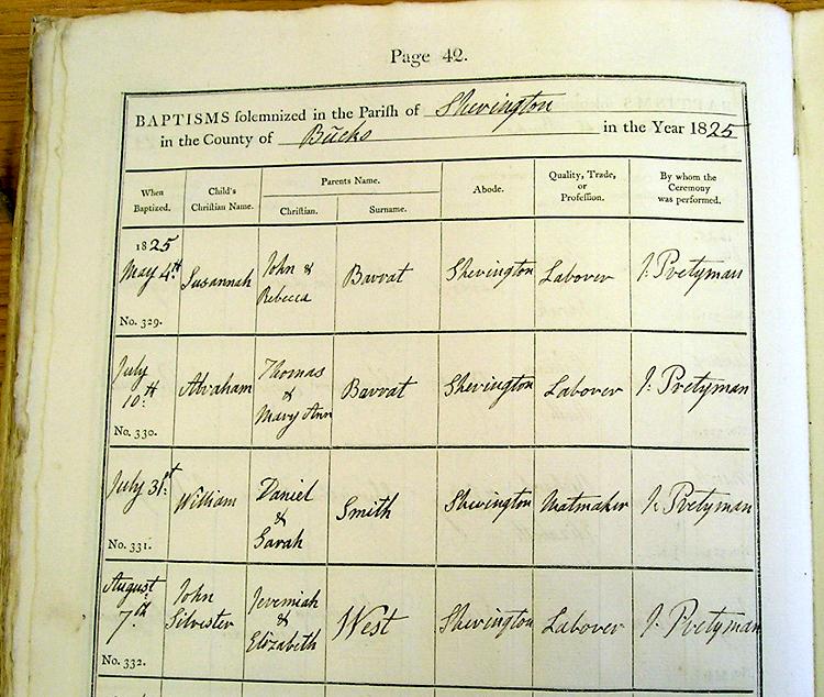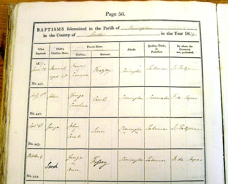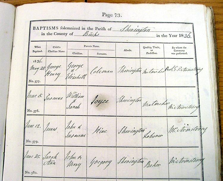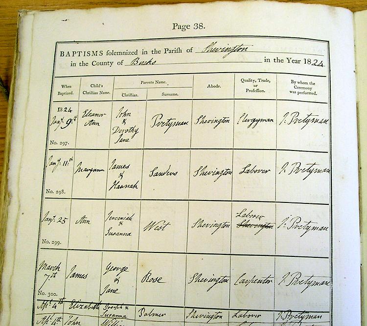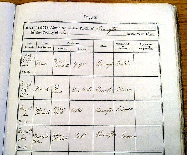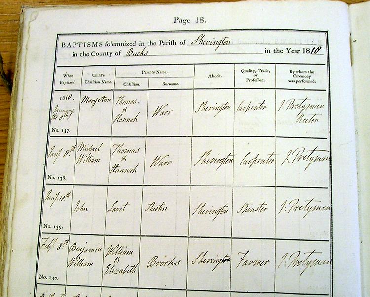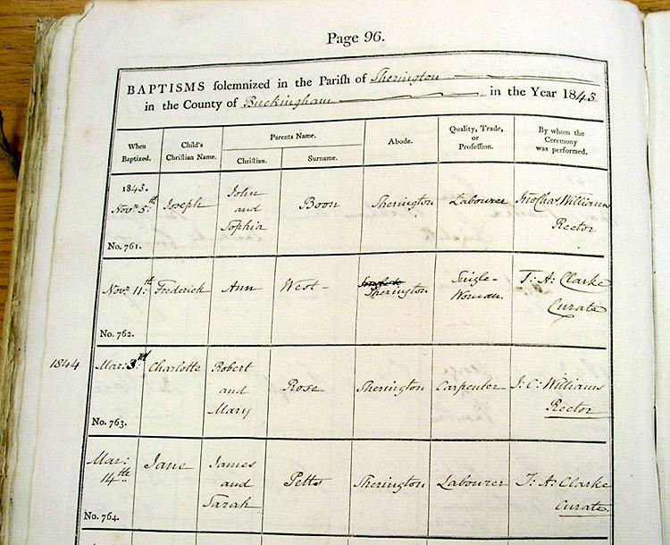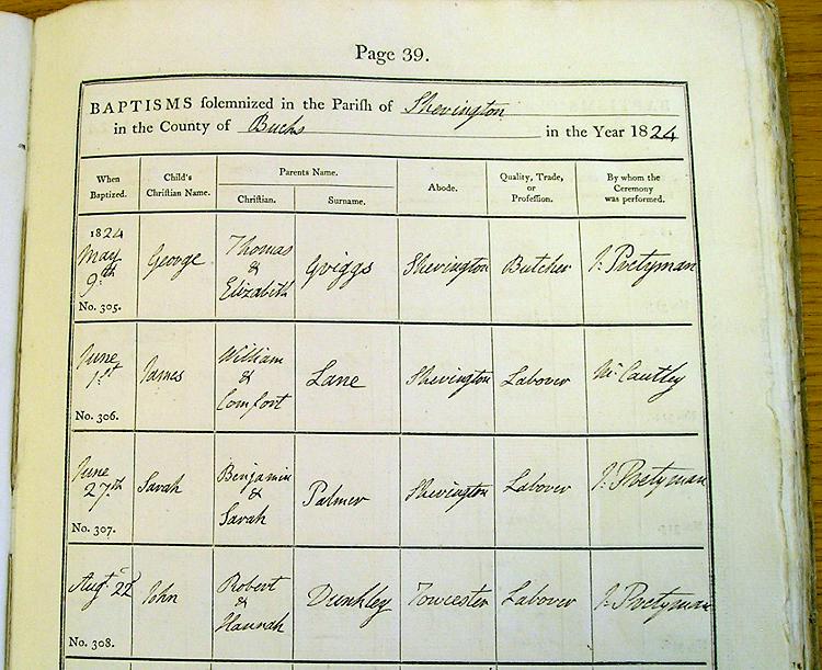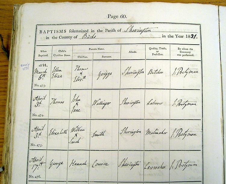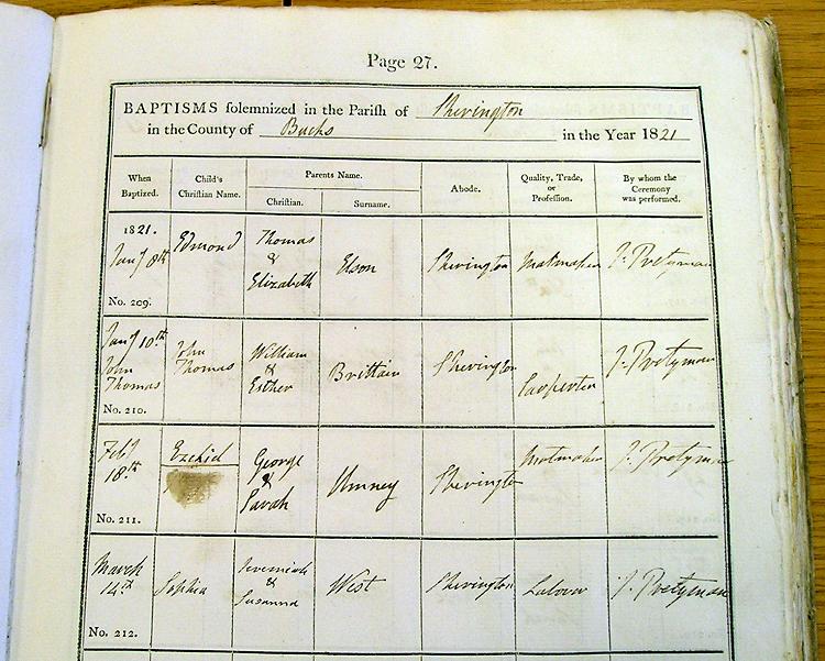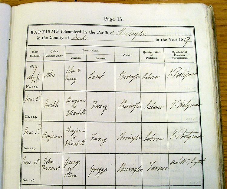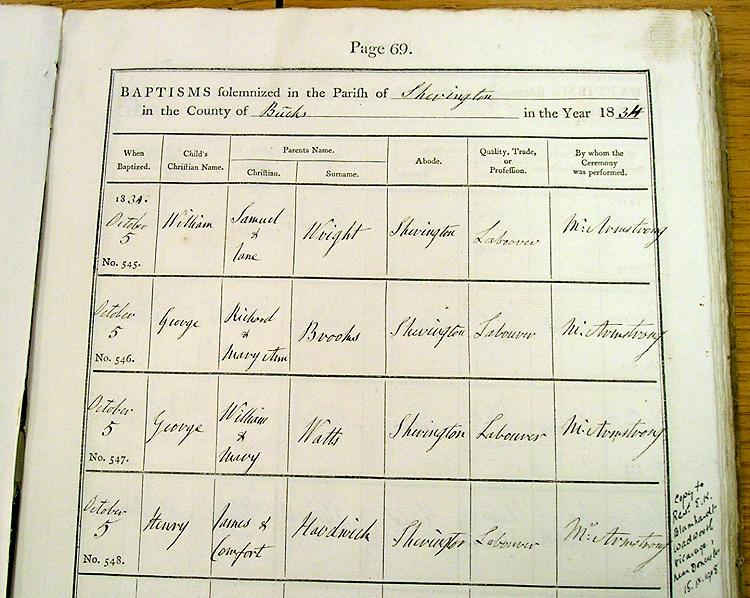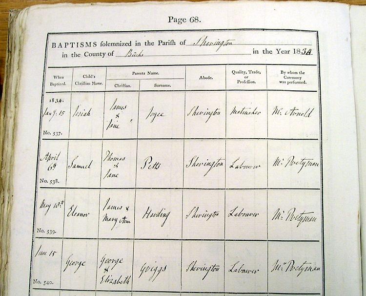 The St Laud’s Parochial Church Council has given Sherington Historical Society permission to take digital photographs of each page in all the Parish Registers, for use in family history research. However, entries less than 100 years old (i.e. after 1912) have not been copied.
