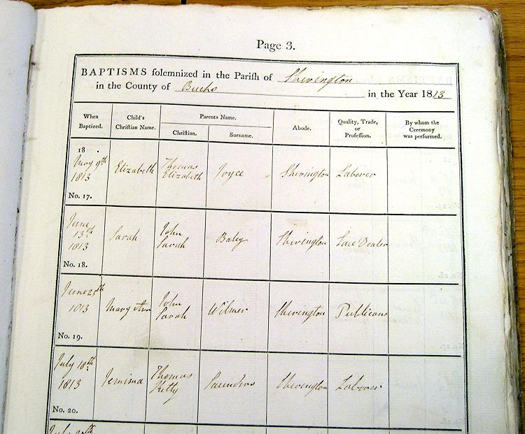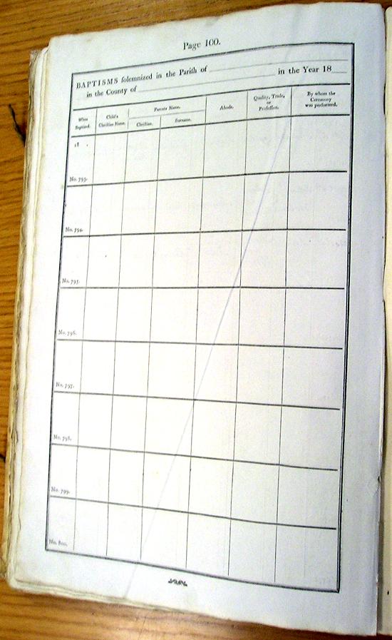 It covers Baptisms between 1813 and 1844. There are 100 pages. Because the page size is long and thin, separate photographs were taken of the top and bottom of each page. There are 8 baptisms per page, and hence 4 in each photo.