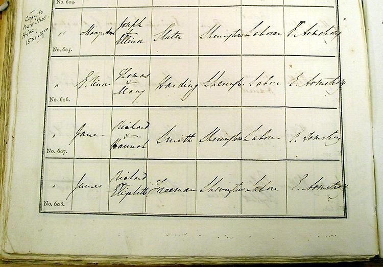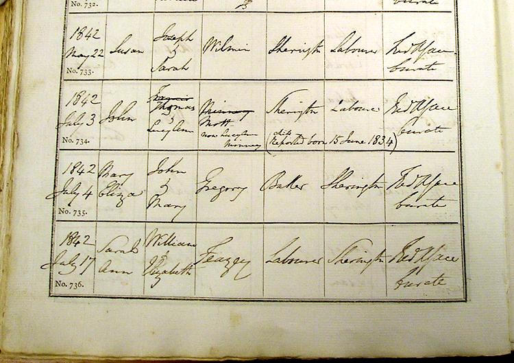 This volume of the St Laud’s Parish Register covers Baptisms between 1813 and 1844. There are 100 pages. Because the page size is long and thin, separate photographs were taken of the top and bottom of each page. There are 8 baptisms per page, and hence 4 in each photo.