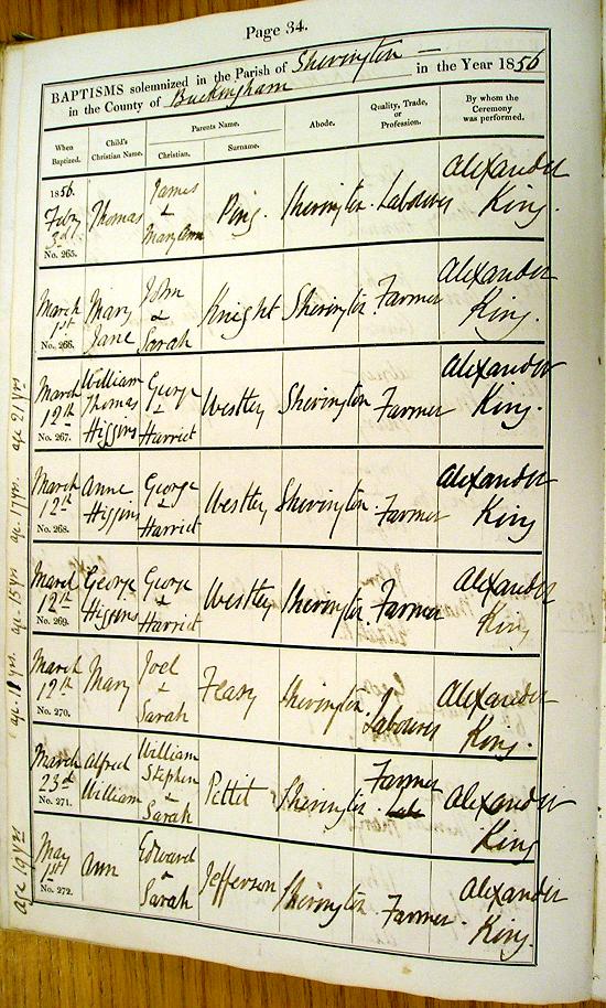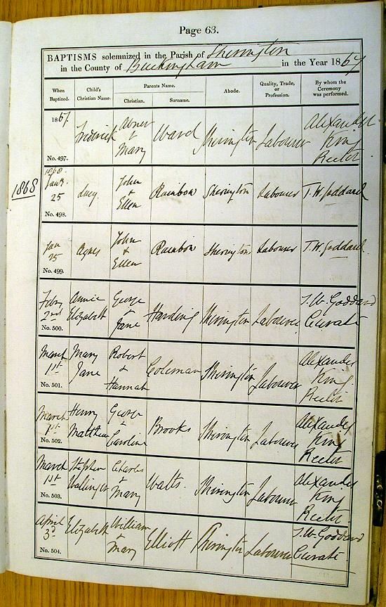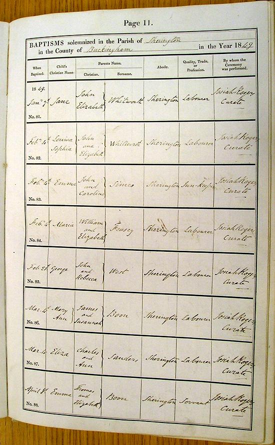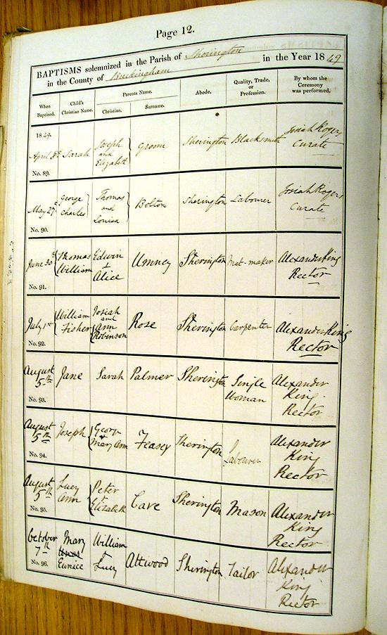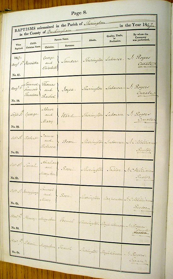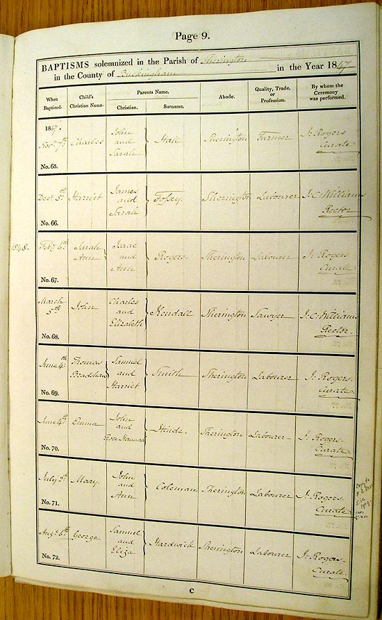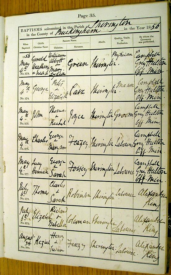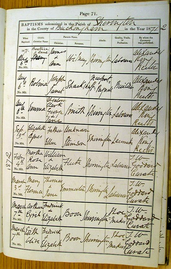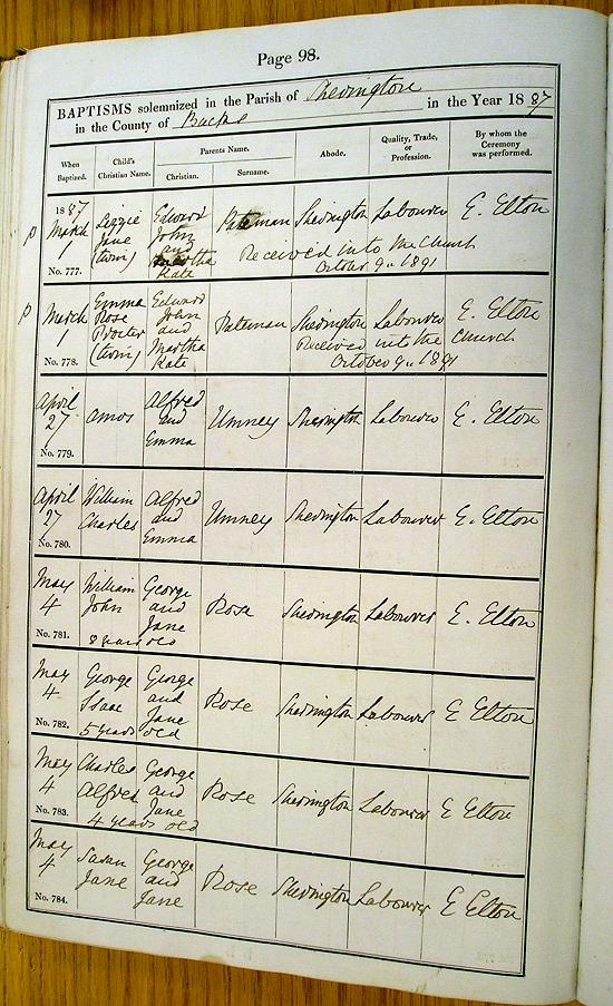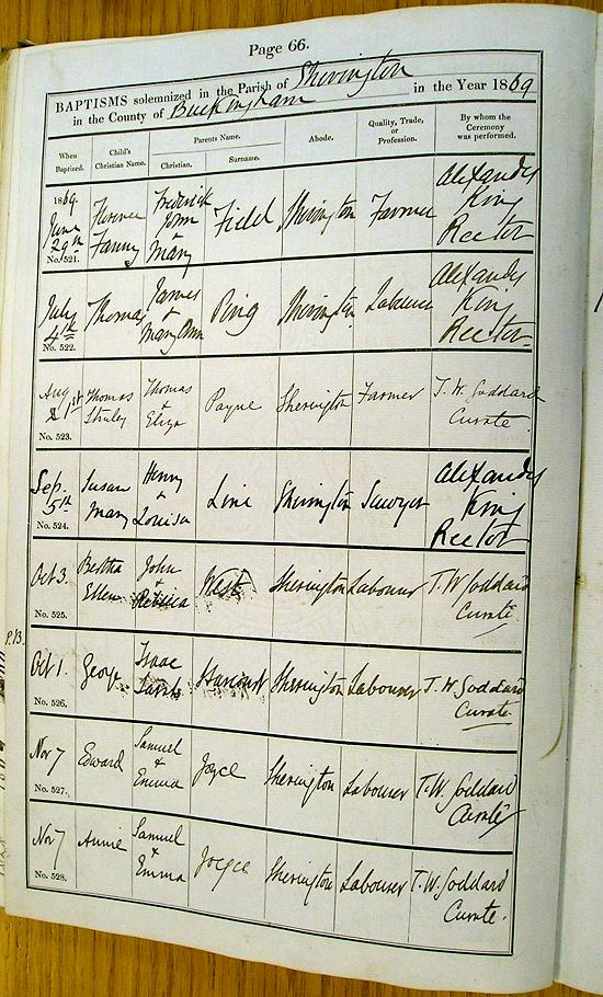 The St Laud’s Parochial Church Council has given Sherington Historical Society permission to take digital photographs of each page in all the Parish Registers, for use in family history research. However, entries less than 100 years old (i.e. after 1912) have not been copied.