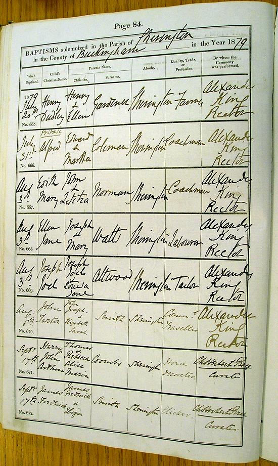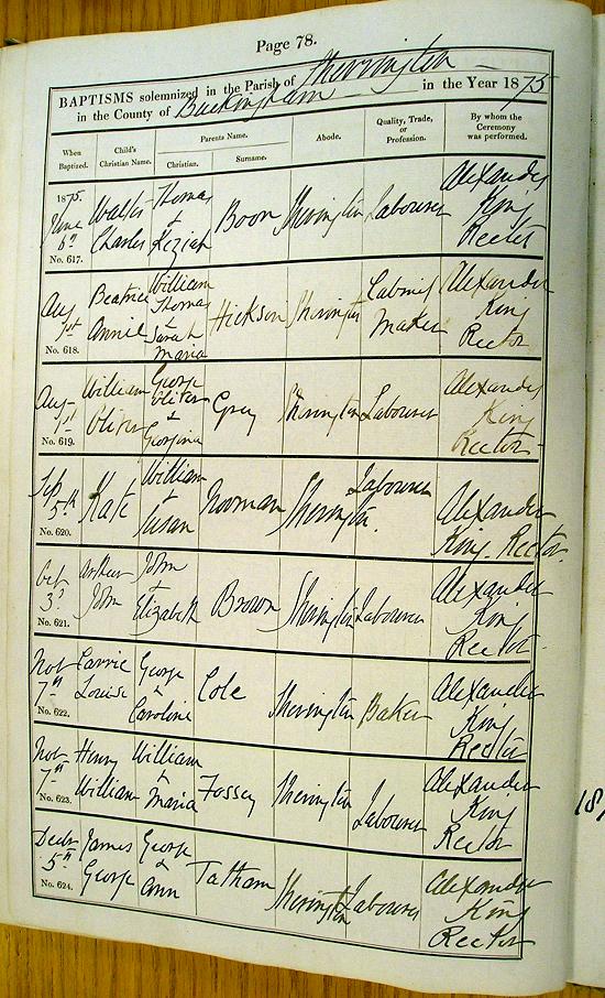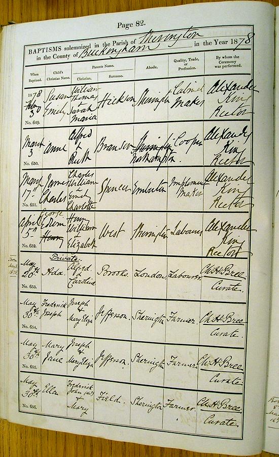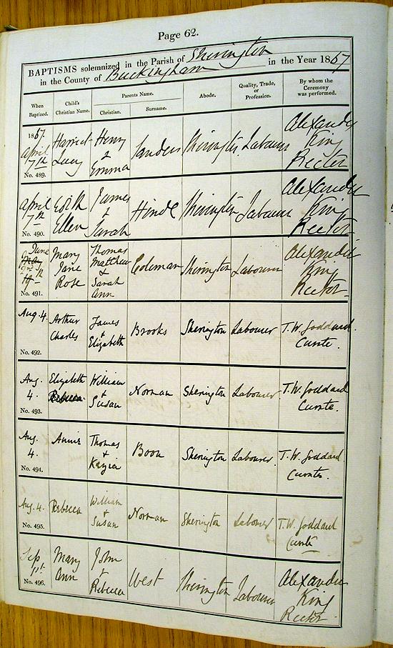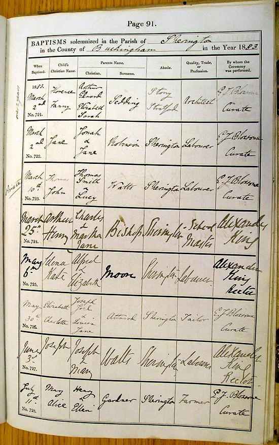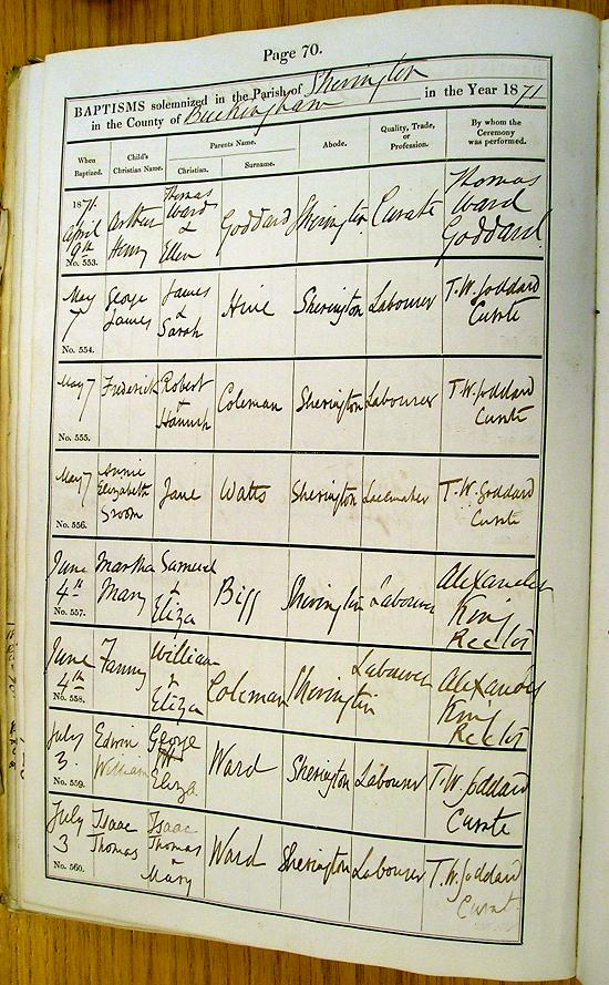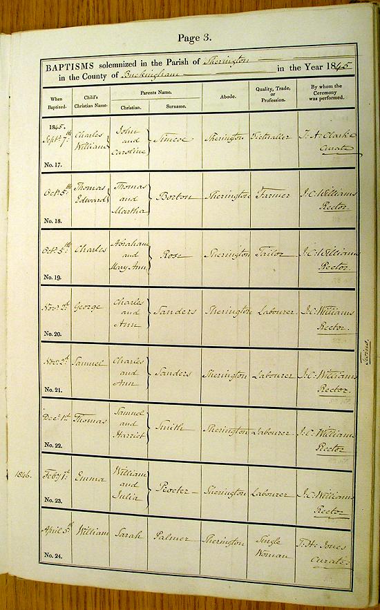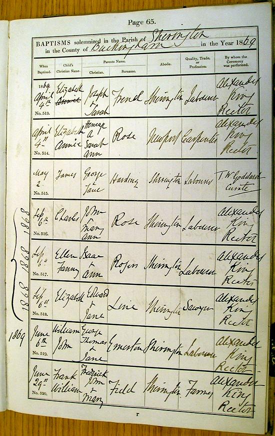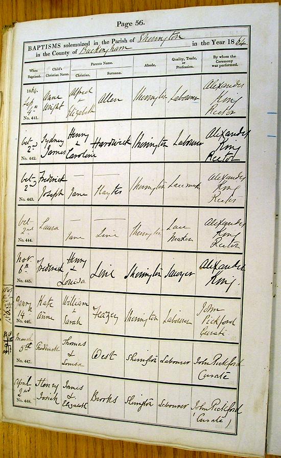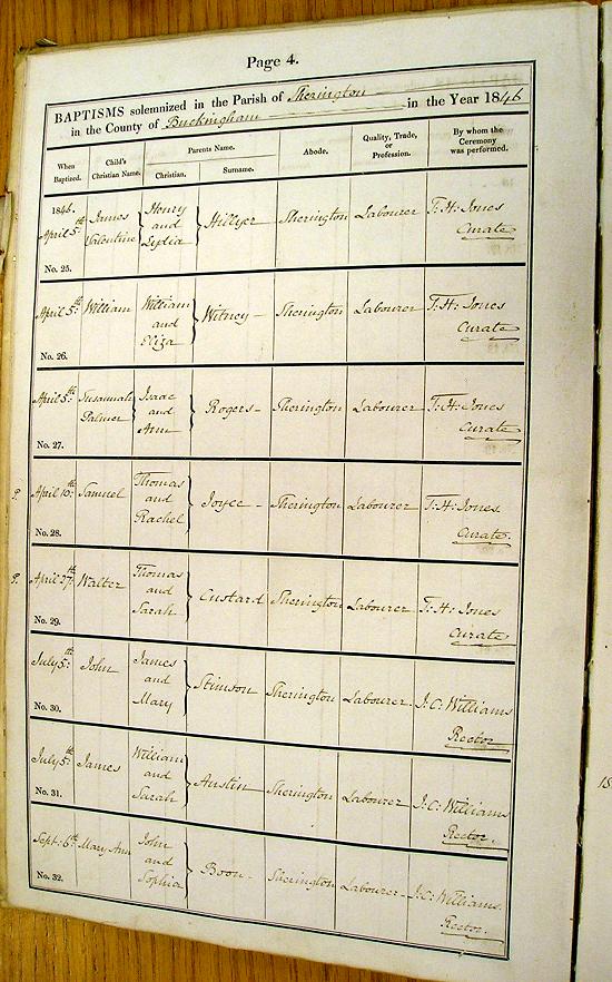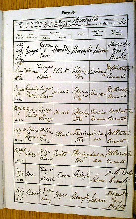 The St Laud’s Parochial Church Council has given Sherington Historical Society permission to take digital photographs of each page in all the Parish Registers, for use in family history research. However, entries less than 100 years old (i.e. after 1912) have not been copied.