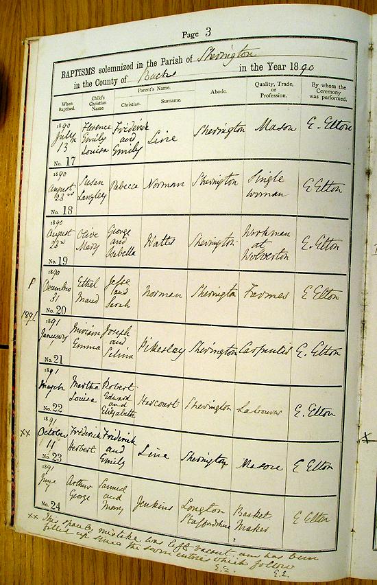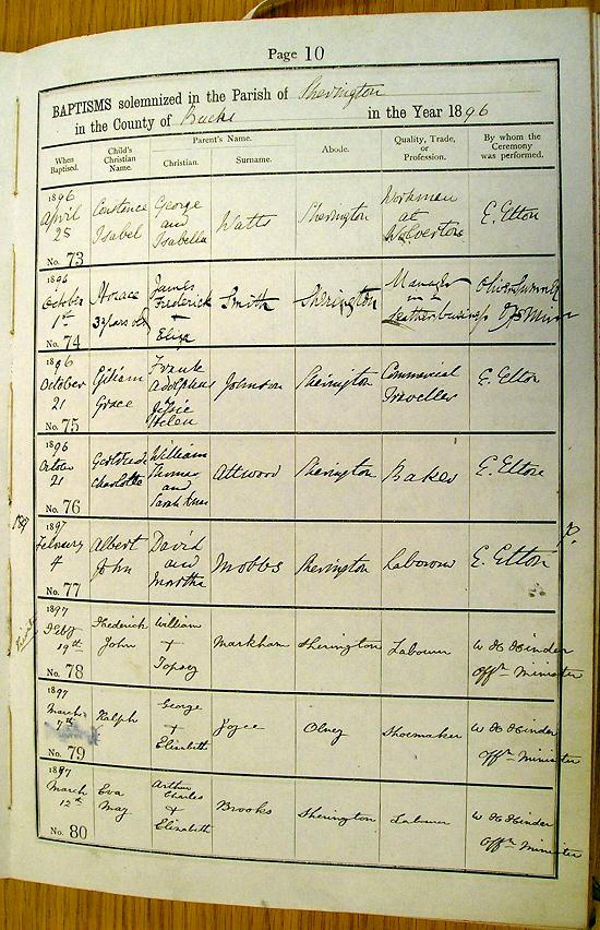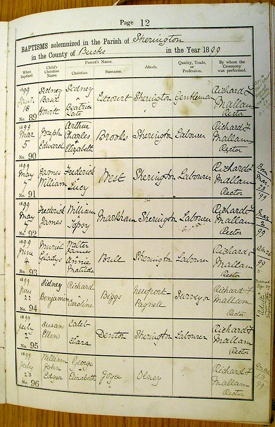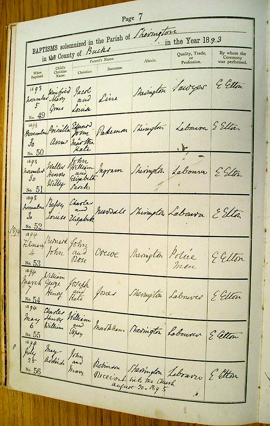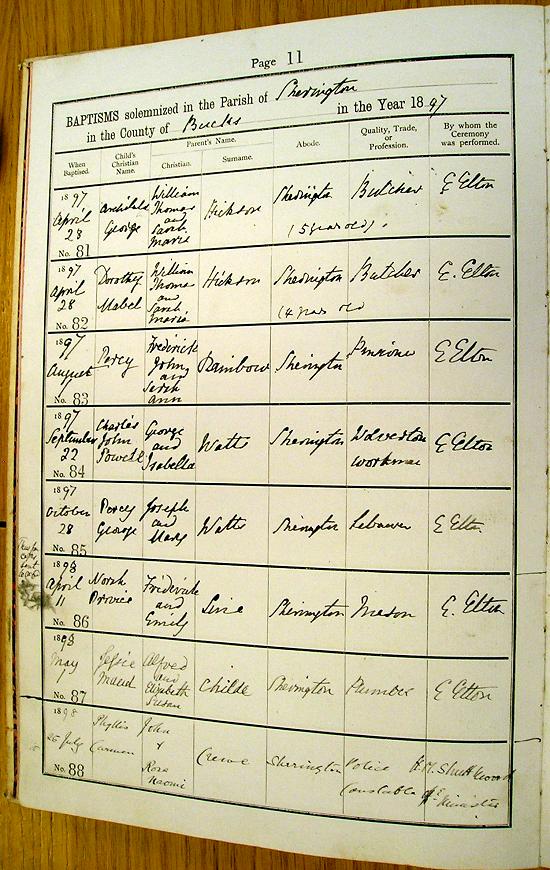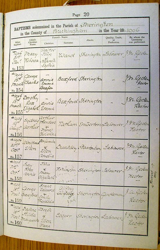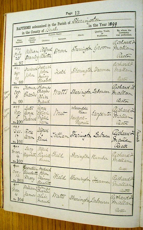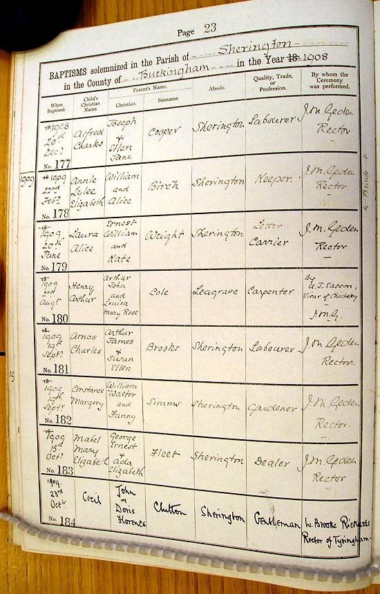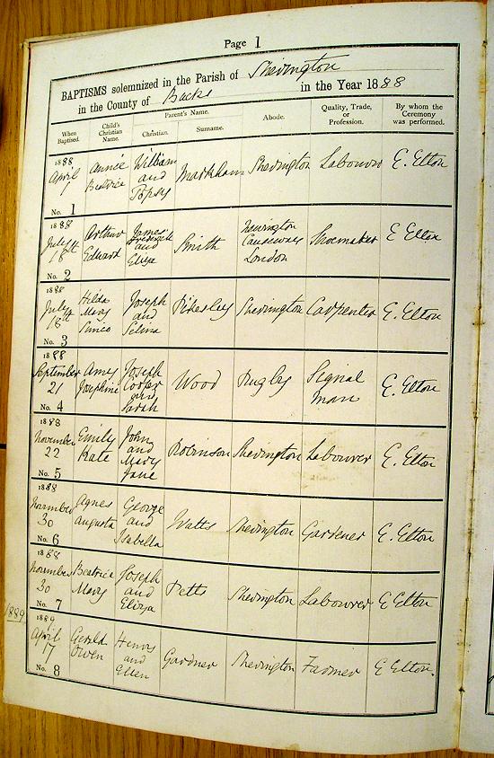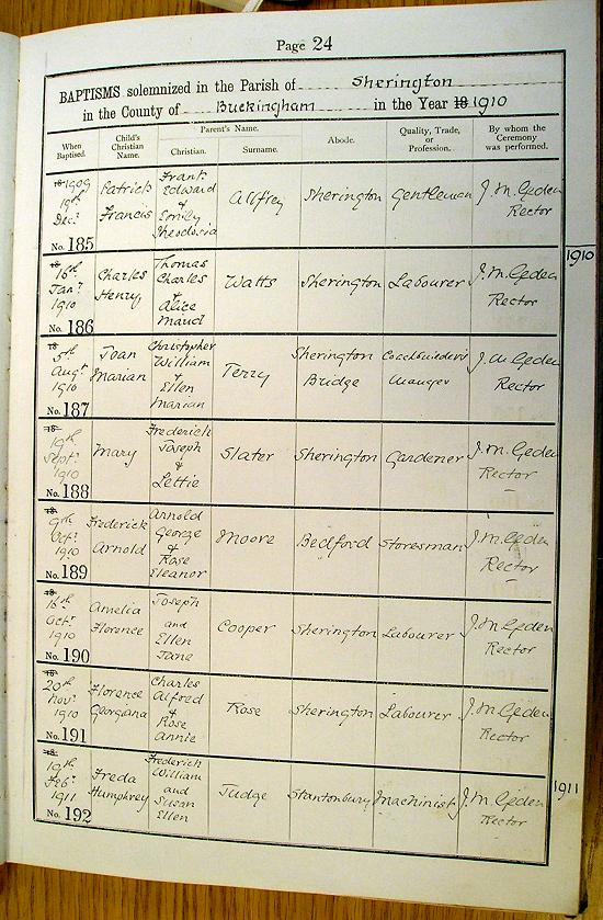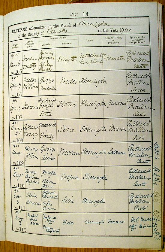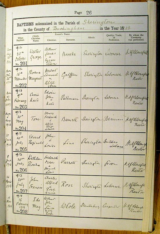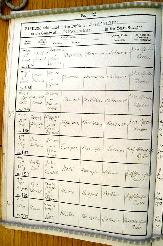 The St Laud’s Parochial Church Council has given Sherington Historical Society permission to take digital photographs of each page in all the Parish Registers, for use in family history research. However, entries less than 100 years old (i.e. after 1912) have not been copied.