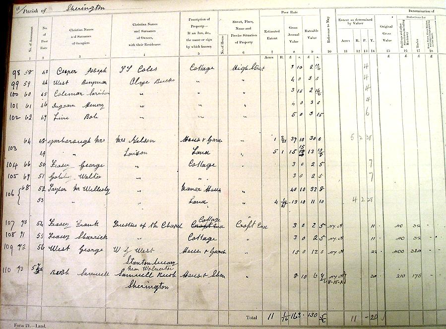 Names/addresses of occupiers/owners plus map references (5 columns – Sherington entries).