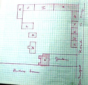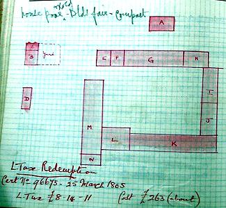 212 | A S&T Ho, B B,W&Th shed C W&Th fowl ho. D 4 B,W&Th B floor pigstyes E B&S B floor Brewho. F B&S B floor Loosebox G B&S B floor Cow ho. 8 H B&S B floor Calfho. I 2 B,W&S Looseboxes J B,W&S open shed 3 K B&S B floor cow ho, 6 L S&S Cobble floor stable 6 & Chaffroom(?) M S&S W floor barn N W&I Lean to shed House poor & v. old – Blds fair – compact L Tax redemption Cert No 96675 25 March 1865 L. Tax £8/14/11 Cost £263 (about) |