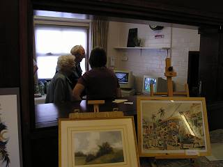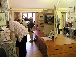 Photos of society members and visitors are shown this page, as well as general views of the exhibits. There are photos of many of the individual items on display (including 179 photos of works of art) in the Art and Artists section (link on the right). Apologies for the quality of some of the photos of the paintings. Reflections of the hall lights and windows made photography very difficult.