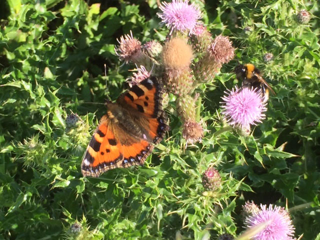 Small tortoiseshell butterfly and bee, Chicheley Road, 17.06.17, 0818
