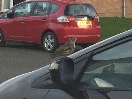 Mistle thrush about to attack car windscreen, Carters Close, 09.12.17, 1323
