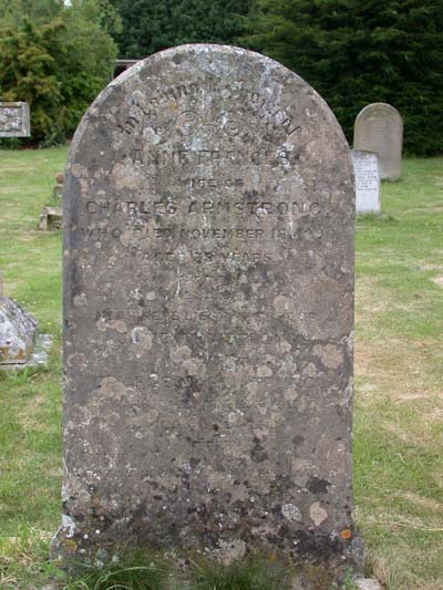 In loving memory of ANN FRANCES wife of CHARLES ARMSTRONG who died November 18th 1894 aged 38 years. Also near here lied the body of JANE ARMSTRONG mother of CHARLES ARMSTRONG who died April 3rd. 1915 aged 90 years “Father in thy gracious keeping Leave me now they servant’s sleeping” Click for Photo |