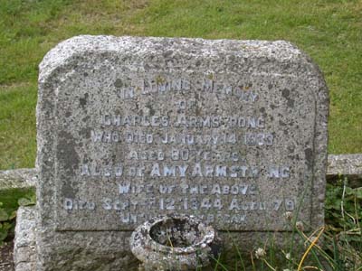 In loving memory of CHARLES ARMSTRONG who died January 14th. 1933 aged 80 years. Also of AMY ARMSTRONG wife of the above died Septer. 12th 1944 aged 79. “Until the day break” Click for Photo |