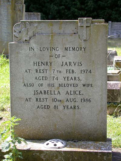 In loving memory of HENRY JARVIS at rest 7th Feb. 1974 aged 74 yearsAlso his beloved wife ISABELLA ALICE at rest 10th Aug. 1986 aged 81 years Click for Photo |