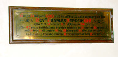 To the Glory of God and in affectionate memory of Rev. Charles JERDEIN who died Dec. 11th 1908 aged 74 years after 43 years of faithful and devoted ministry as Rector of Gayhurst and Stoke Goldington. This window and tablet are erected by his many friends and the parishioners of both parishes. |