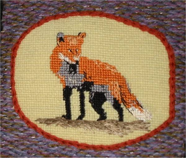 Our designer made coloured drawings for each of these 35 lozenges. The outline was traced onto 16 hpi canvas and each stitcher worked in DMC stranded cotton from a copy of the original.