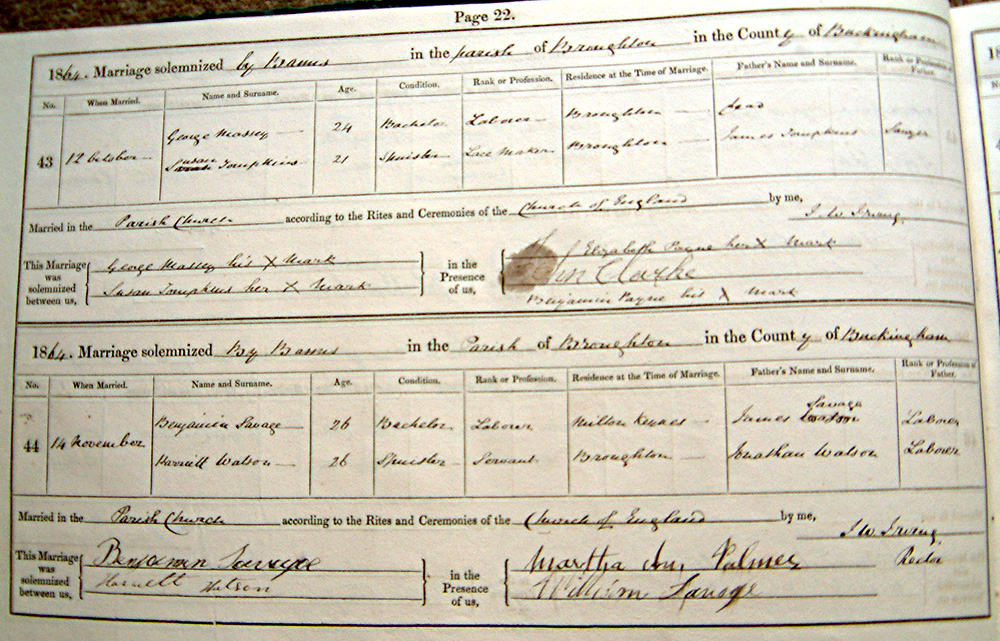 Benjamin Payne also signs as witness with his mark. No information about groom's father except that he was dead.