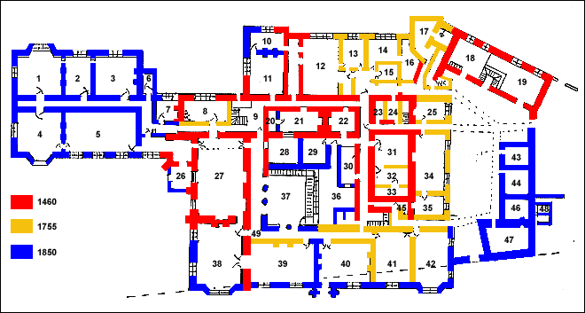 Thornton College. Late 19th century plan of ground floor, showing the three main periods of building