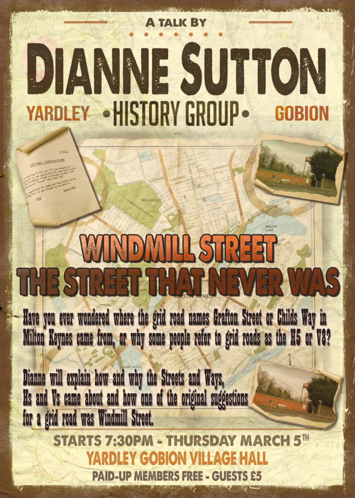 Have you ever wondered where the grid road names Grafton Street or Childs Way in Milton Keynes came from, or why some people refer to grid roads as the H5 or V8? Dianne will explain how and why the Streets and Ways, Hs and Vs came about and how one of the original suggestions for a grid road was Windmill Street.
